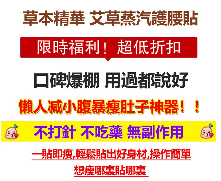 艾草蒸汽護腰貼之減肥貼艾草肚臍貼塑身產品,只要每天在肚臍上貼祛除混氧减肥瘦身貼、排毒减脂貼、暖宫貼不用節食,不用運動就能暖宮驅寒,祛除濕氣,減肥瘦身。
